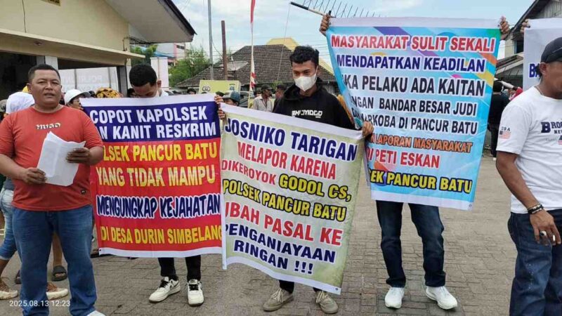Pancur Batu | Ratusan warga Desa Durin Simbelang, Kecamatan Pancur Batu bersama Aliansi Masyarakat Sumut mendemo Polsek Pancur Batu membawa spanduk bertuliskan “ Copot Kapolsek dan Kanit Reskrim Polsek Pancur Batu Yang Tidak Mampu Mengungkap Kejahatan Di Desa Durin Simbelang” pada rabu 13 Agustus 2025.